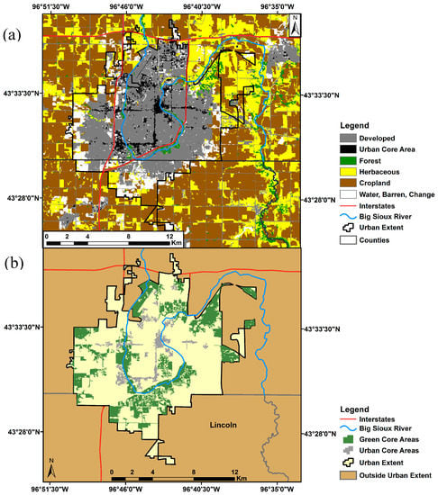 (a) Example of land cover type (LCT) classification (derived from the 2011 National Land Cover Database LCT product) over Sioux Falls, SD. “Water”, “Barren”, and “Change” pixels (white) were excluded from the analyses; (b) Example of the four urban spatial subregions used in the analysis including: urban extent (UE), urban core areas (UCAs), green core areas (GCAs), and areas outside of the UE over Sioux Falls, SD.