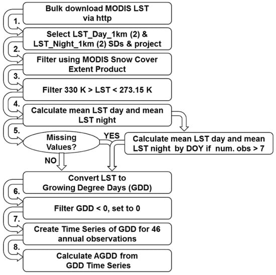 Processing outline for MODIS Land Surface Temperature (LST) to accumulated growing degree-days (AGDD) algorithm that converts MODIS LST 8-day composites into annual time series of AGDD (adapted from [40]).