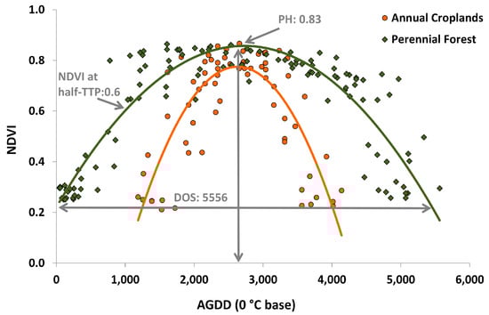 Quadratic land surface phenology model fit to the 2003–2012 time series of Web-Enabled Landsat Data Normalized Difference Vegetation Index NDVI vs. MODIS Land Surface Temperature-derived accumulated growing degree-days for an example of perennial forest (green) and annual cropland (orange) pixels selected from Omaha, NE. In grey are the phenometrics derived from the model.