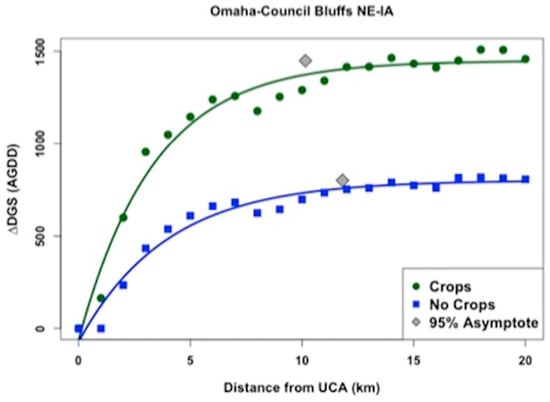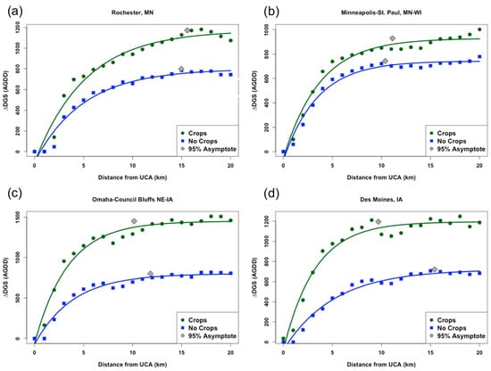 Exponential trend model fit to difference in duration of growing season (ΔDGSAGDD) as a function of distance from nearest UCA for four selected cities. Differences in ΔDGSAGDD calculated with croplands (green) and without croplands (blue) are evident, particularly in the predominantly agricultural areas surrounding Omaha-Council Bluffs, NE-IA, and Des Moines, IA, compared to rural Rochester, MN, and Minneapolis-St. Paul, MN-WI, where forests and herbaceous land covers are more widely distributed. The grey diamonds show where the exponential model reaches 95% of asymptotic values, used to calculate the magnitude of ΔDGSAGDD and the distance at which urban effects become insignificant.