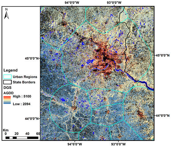 Figure 7 shows DGSAGDD over the Minneapolis-St. Paul, MN region. Darker shades of red relate to longer DGSAGDD, clustered near the densely impervious UCAs of each city. Figure 8 shows the corresponding LCT over the greater Minneapolis-St. Paul region. Notice the higher DGSAGDD in the perennial LCTs (developed, forest, herbaceous) located within the cities compared to annual croplands outside of the urban areas. This spatial pattern demonstrates why croplands were omitted from the DGSAGDD analysis: (1) there are little to no cropland areas inside of cities from which to compare; and (2) the seasonal development of annual croplands is dictated by management factors (i.e., field accessibility, timing of tillage, and irrigation) rather than by local environmental and atmospheric conditions (i.e., thermal time and the UHI effect).