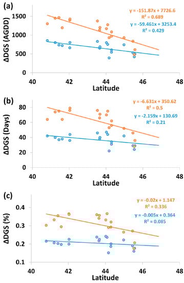 Difference in duration of growing season (ΔDGSAGDD) in terms of: (a) accumulated growing degree-days (AGDD); (b) calendar days; and (c) percentage of mean DGSAGDD for results from model fit with (orange) and without (blue) croplands. Notice that ΔDGS is significantly related to latitude in terms of: total AGDD (a); but not relative (%) ΔDGS (c).