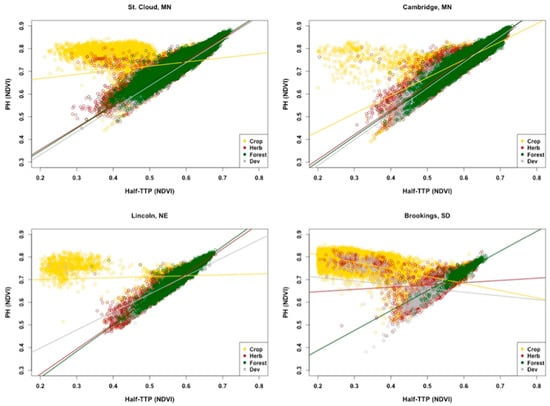 Examples of linear regression model fit to PHNDVI vs. Half-TTPNDVI for four selected cities. Note the large variation in Half-TTPNDVI for croplands (yellow) and positive linear relationships seen in the three perennial vegetation land cover types.