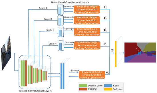 Dual multi-scale manifold ranking (DMSMR) network overview. For each dilated convolutional layer, a non-dilated convolution layer is applied following the pooling layer in each scale. The dilated and non-dilated convolution layers form a dual layer, in which the corresponding layers are optimized with the embedded feedforward single stream manifold ranking network. The scale factor is implicitly represented by the pooling layer in each block. Figure 2 illustrates how to embed the manifold ranking optimization method into the single stream network (marked with orange color in this figure). The optimized outputs of each scale, that is, generated in each scale, are combined by Equation (17).
