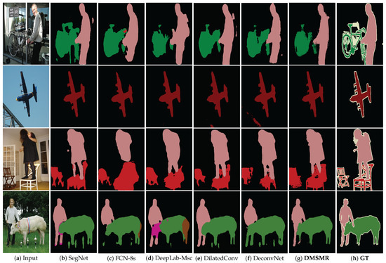 We have devised two groups of experiments on high resolution datasets, including close-range images (PASCAL VOC dataset and CamVid dataset) and remote sensing images (ISPRS Vaihingen dataset and EvLab-SS dataset), to validate the effectiveness of our model and find the approach that can be potentially applied to remote sensing image processing. For fair evaluation, the first group, which includes the PASCAL VOC dataset [72] and ISPRS Vaihingen dataset [73], is designed for comparison with a few recent state-of-the-art methods whose results are publicly available online. In this group, we evaluate our model by submitting the results to the server, wherein the ground truth of testing images are not available to all researchers. The second group, which includes the CamVid dataset [68,69] and the EvLab-SS dataset (See Section 5.2.2), is used to evaluate the capacity of the proposed DMSMR approach by comparing the methods that employ only one of the three strategies, namely, multi-scale convolution (MS), broader receptive field (Dilated) and MR optimization (MR-opti) approaches. The detailed structures of the network with different strategies are explained in the Appendix (See Figure A1 and Table A1).