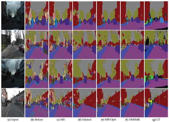 Quantitative evaluation of the semantic segmentation results on CamVid dataset [68,69]. The proposed DMSMR approach outperforms the methods employing only one strategy.