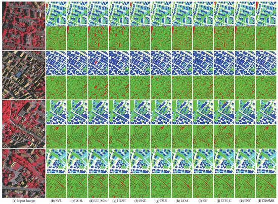 Visualization of the comparative results on a few Vaihingen testing imagery (tile numbers 2, 4, 6 and 8). For each image, we generate the dense prediction results and corresponding error maps (red/green image) with different approaches.
