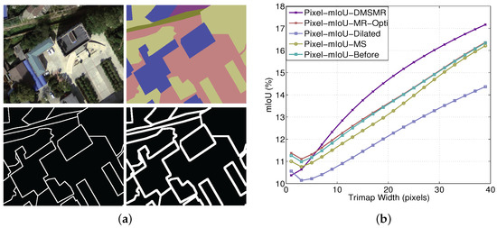 We employ the pixel mean intersection over union (mIoU) measurement with respect to the band width around the object boundaries as in [24] on the CamVid benchmark to analyze the expressive power of the proposed DMSMR network. The experimental results are illustrated in Figure 4. The comparisons between the DMSMR approach and the networks employing different strategies are reported in Table 3. We also analyze the accuracy change with respect to boundary in Figure 5. As shown in Figure 5a, we consider a narrow band, that is, trimap [81] boundary, on CamVid dataset. A trimap divides an image into three regions of foreground, background and unknown. Figure 5b shows boundary accuracy as the trimap width is varied. In this experiment, we set the same parameters as those in the DMSMR model but with different strategies as previously stated. The three strategies, namely, multi-scale convolution (MS), broader receptive field (Dilated) and manifold ranking optimization (MR-Opti) approaches, are utilized for comparison. Obviously, different strategies yield different performance for each of the classes. The MS and Dilated approaches help boost the performance in the situation where color and texture are uniformly distributed. In addition, the MR-Opti achieves a score that is approximately 2.5% better than those of the MS and Dilated methods because more contextual information are considered. The results demonstrate that the combination of MS, Dilated and MR-Opti approaches is possibly a better approach for semantic segmentation task on close-range images. Figure 5 shows that improving the recognition of pixels around the boundary helps delineate the object because the smoothness potentials of the correctly detected pixels increase. Additionally, as can be seen from Table 3, the DMSMR method outperforms the approaches that employ only one strategy, indicating that the DMSMR approach can improve the semantic segmentation result further by combing these strategies in close-range situations.