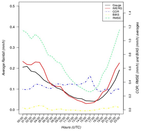 Average hourly rainfall (mm/h) for Integrated Multi-satellitE Retrievals for Global Precipitation Measurement (IMERG) (red) and Gauge (black) data for the period 1 April 2014 to 31 October 2015. Hourly average statistics results are shown. Pearson correlation coefficient (COR): blue; bias (BIAS) (mm/h): yellow; and root-mean-square error (RMSE) (mm/h): green, for the same period.