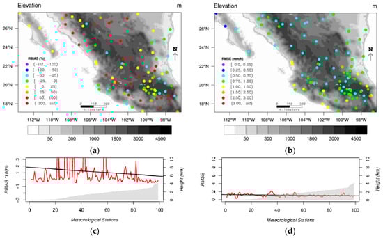 Figure 4a,c for the RBIAS and Figure 4b,d for the RMSE are homologous to Figure 3a,c respectively. Figure 4a shows that for more than the half of the meteorological stations IMERG overestimates hourly rain gauges. Also, it can be noticed that overestimations values are higher than the underestimation values. For some meteorological stations the overestimation can be two or three times higher than their mean hourly rain gauges. In addition, Figure 4c shows that the relative bias clearly decreases with elevation.