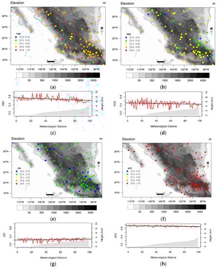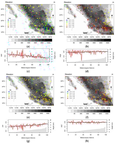 Categorical statistics (FAR, POD, CSI and ACC) for daily precipitation data are shown in Figure 10 in the same manner RBIAS and RMSE were shown in Figure 9. Therefore, each categorical statistic is represented in a map to analyze spatial behavior and in a trend plot to analyze its relationship with respect to the elevation of the meteorological stations.