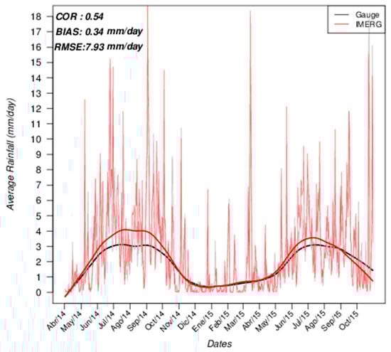 In Figure 6 the average daily rainfall for the whole study period is presented. Average values were calculated using all meteorological stations. The thick red and black lines resulted from smoothing raw IMERG and gauge average daily rainfall respectively so that trends can be easily analyzed. The smoothing procedure consists of applying locally weighted regression to scattered data [23]. In this figure, the dry and wet seasons during the study period can be easily noted. During the dry season (November to April [9]) average daily rainfall falls under 1 mm (see trend lines) and reaches higher values during the wet season. It is also shown that IMERG better represents the daily precipitation in the dry season and during the wet season IMERG mostly overestimates gauge data. Moreover, average daily rainfall values can reach over 18 mm/day during extreme precipitation events.