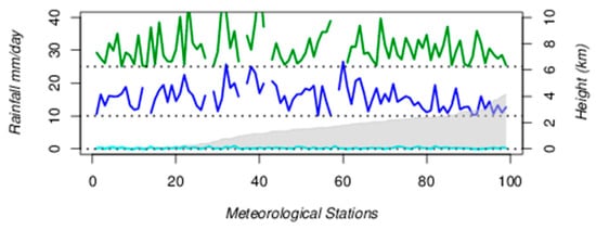 In addition, Figure 7 shows the absolute errors of the mean daily rainfall for each meteorological station and for precipitation intensities of 0–10 mm/day (solid cyan line), 10–25 mm/day (solid blue line) and 25 mm/day or greater (solid green line). These absolute errors were calculated using the mean values of the daily precipitation data (IMERG and gauge) for each station. They represent how much IMERG deviates from the gauge data. For example, the figure shows that for station 1 (x-axis) IMERG deviates from the gauge data in almost 5 mm/day for precipitation intensities of 25 mm/day or greater. Also, the absence of data in green and blue lines means that precipitation intensities corresponding to their respective ranges were not found for the corresponding meteorological station.