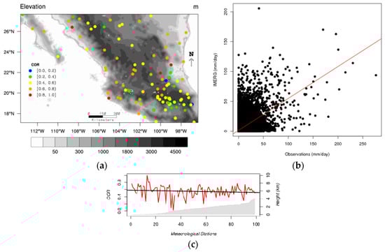 (a) Correlation (COR) map; (b) scatter plot for daily precipitation events and (c) correlation as a function of meteorological stations elevations (red line); the black line shows the trend and the elevation of the meteorological stations is represented by the gray, shaded area. IMERG estimates and gauge daily data from 1 April 2014 to 31 October 2015 have been used for these calculations.