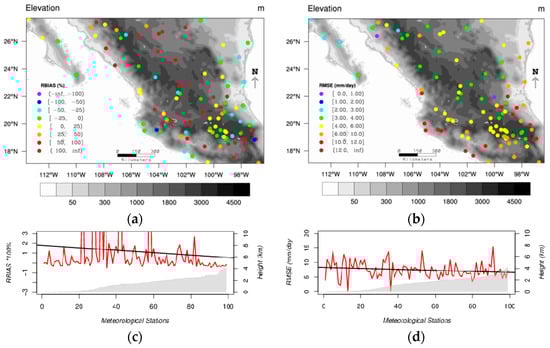 In a manner similar to that of Figure 4, Figure 9 shows the RBIAS and RMSE statistics for the daily analysis. Figure 9a shows that the bulk of the stations have RBIAS ranging between −50 and 50%; while most of the rest of the stations significantly overestimate observations. The trend of the RBIAS in Figure 9c indicates that the overestimation decreases with elevation.