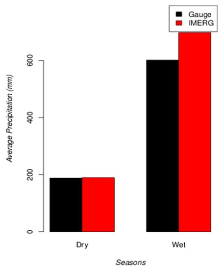 Figure 11 shows the average seasonal precipitation (mm) for the dry and wet seasons and for IMERG and gauge data. The average is calculated using all meteorological stations and the dry season is considered to be from November to April. Here, it can be noted that during the dry season the average precipitation is close to 200 mm and during wet season that amount is tripled. During the dry season IMERG quantifies the average precipitation quite well and overestimates the precipitation observed during the wet season by approximately 100 mm.
