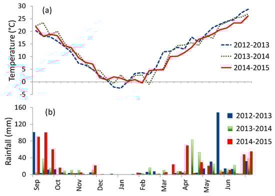The weather data were collected at the weather station ID 57034 (34.25°N, 108.22°E), by the China Meteorological Administration and made available on the China Meteorological Data Sharing Service System (CMDSSS, http://cdc.cma.gov.cn). They included: temperature, rainfall, relative humidity and wind speed. Other climatic data needed to drive the crop models, such as evapotranspiration and solar radiation, were derived from these variables. Reference evapotranspiration was calculated using the ET0 calculator [38], whereas solar radiation was estimated from the relationship proposed by [39]. Temperatures and rainfall for winter wheat growth seasons of 2012–2013, 2013–2014 and 2014–2015 in Yangling are shown in Figure 2.