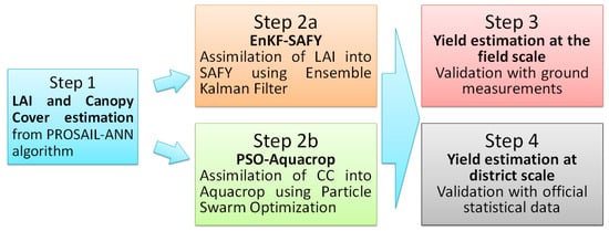 It is possible to divide the methodology adopted (Figure 3) into four steps: in the first step the biophysical variables LAI and CC were estimated; in the second step the assimilation was carried out: LAI values were assimilated into the SAFY model through an updating method based on the EnKF, whereas CC values were assimilated into Aquacrop using the PSO method; in the third step the two methodologies were applied and validated at the field scale using ground measurements; in the fourth step the method was extended to the district scale and validated using official statistical data. Details on each of these steps is provided in the following paragraphs.