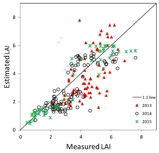 LAI and CC were estimated using the ANN algorithm described in Section 2.2.2 for all the images acquired by HJ-1A, HJ-1B and Landsat 8 (Table 2) in the 3 years (from 2013 to 2015). Some acquisition dates of the images were near, i.e., within 1 to 4 days, the dates when ground measurements were performed. For these images, the ground sampling points were identified according to their GPS coordinates, and measured and estimated LAI and CC were compared.