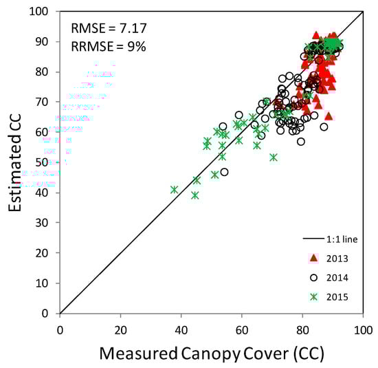 Figure 4 shows the comparison between LAI estimated from the satellite images employing the ANN algorithm and LAI measured during the field campaigns. The overall relative root mean square error (RRMSE) for LAI for the three years was 30%. The root-mean-square error (RMSE) and RRMSE for the three years examined, both for CC and LAI, are shown in detail in Table 6. The estimation error is larger for higher values of LAI, in fact for LAI between 0 and 2 the difference between estimates and measures is small (Figure 4), while particularly for LAI values between 3 and 4 the error tends to be higher. These results indicate that the algorithm tends to underestimate LAI, especially for 2013, for which the results were worse that for others years (Table 6).