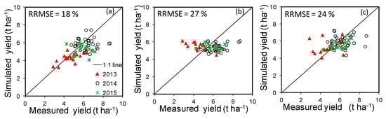 Figure 6b,c both show the comparison between measured and simulated yields resulting from the application of the PSO assimilation method to the Aquacrop model. In Figure 6b the simulations were preceded by a single calibration of the model (using two data points from 2014), while in Figure 6c the model had been previously calibrated for each year considered.