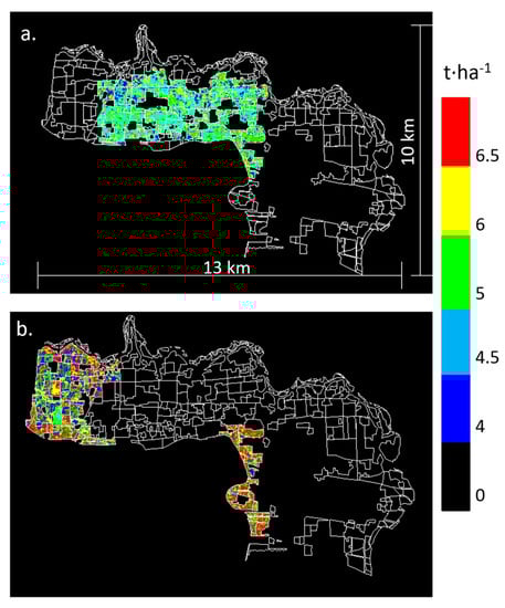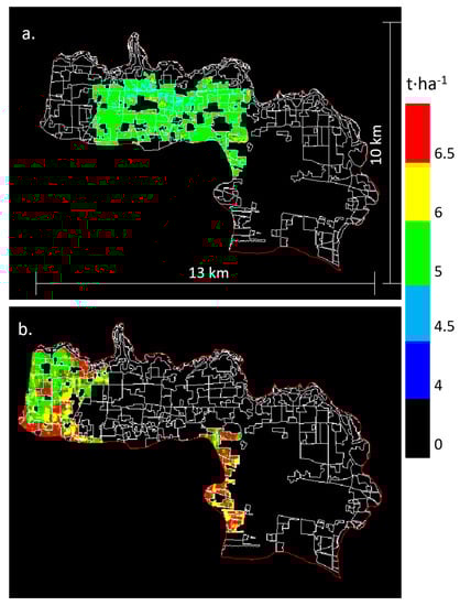 Wheat yield map (t∙ha−1) for Yangling estimated using the EnKF assimilation method with the SAFY model for 2013 (a) and 2014 (b).