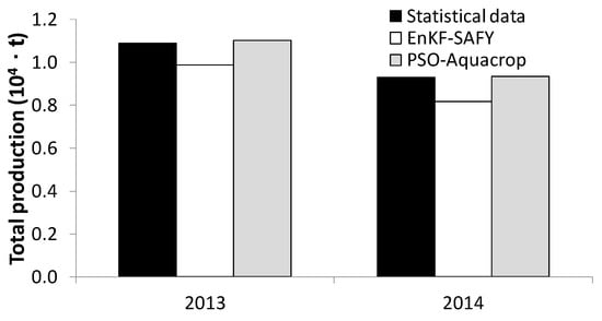All the estimates obtained with Aquacrop shown in Figure 8 were obtained with the model calibrated for each year before the application of the assimilation algorithm. Using the PSO with Aquacrop, the average yield per unit on the studied area was of 5.56 t∙ha−1, very close to the official statistics value, whereas the total production estimated was of 1.10 × 104 t, with an estimation error of about 118 t. For 2014 the same procedure was applied, and the yield per unit area estimated with PSO and Aquacrop was of about 5.97 × 104 t, while the total production estimated for this year was of 0.93 × 104 t. Figure 9 summarizes the comparison between assimilation results and official statistics for the Yiangling administrative area.