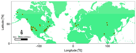 Tree-ring data were downloaded from the International Tree-Ring Data Bank (ITRDB) [31] which is a repository containing tree-ring data [32]. All downloaded time series from the ITRDB were filtered for three requirements (1) tree-ring widths complete for the period 1982 to 2010, (2) no missing NDVI data in the time-series of each overlapping pixel, and (3) having forest cover in the corresponding remote sensing pixel. For the third requirement, we used the world forest-cover map GlobCover from the European Space Agency, which is based on Envisat Medium Resolution Imaging Spectrometer (MERIS) data between December 2004 and June 2006 [33]. We excluded tree-ring sites in remote sensing pixels covering bare areas, water bodies, areas with permanent snow and ice, or areas located in the Southern Hemisphere. In total, 69 sites were retained for the analysis (Figure 1). Each tree-ring series was detrended on a per-site basis using a cubic-smoothing spline with a frequency response of 50% at 32 years [34]. This was done to remove the trend present in the original raw tree-ring width measurements, while at the same time preserving the inter-annual to decadal variability. Prior to detrending, the series were power-transformed to remove temporal heteroscedasticity, and were then robustly averaged into dimensionless chronologies of RWIs. Readers unfamiliar with tree-ring detrending and chronology development can refer to Cook et al. [9]. Table S1 (Supplementary) gives all information on sites, species, climate zones (see Section 2.3), chronology coverage, and important tree-ring metrics.