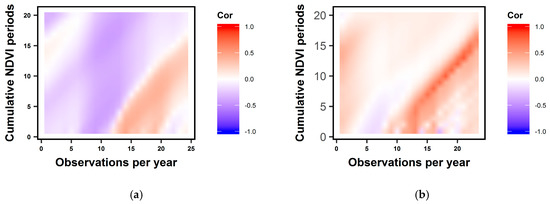 Pearson correlation coefficients between time series of ring width index (RWI) and cumulative NDVI at different temporal scales (1–20, y-axis) at a continental D climate site with a coniferous forest in Utah, United States of America for (a) GIMMS3g, 8 km resolution (1982–2010) with 24 time points in a year (x-axis) and (b) MODIS, 250 m resolution (2001–2010) with 23 time points in a year (x-axis).