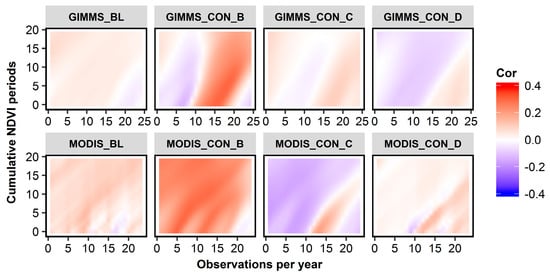 In general, the correlation patterns between RWI and NDVI show these positive inter-annual associations, yet strong variations with species type (deciduous versus coniferous), climatic zone (B, C, and D), spatial scale (GIMMS3g versus MODIS), and integration time (up to 20 observations of the NDVI time series) are observed. Figure 3 displays the correlation patterns for all sites summarized as mean correlations of the four groups. For broadleaf species, growth in terms of RWI is (if at all) represented by MODIS NDVI during spring and the optimal length of the cumulative time period is not well defined. The signal for GIMMS3g NDVI is even weaker, more spread-out, and does not display any pattern. For coniferous trees in the semiarid to arid climate zone B, tree growth is strongly associated with a wide-ranging MODIS NDVI signal, from the start of the year until early summer and for cumulative periods of up to 15–20 NDVI observations. For GIMMS3g NDVI, RWI is tightly linked to NDVI of summer months and up to 20 cumulative NDVI observations. For conifers in climate zone C, the MODIS NDVI growth signal is stronger than the GIMMS3g NDVI signal. It is represented by summer months at a cumulative period of up to 7–10 NDVI observations, whereas the weaker GIMMS3g signal has cumulative periods of up to 15–20 NDVI observations. For conifers in climate zone D, the MODIS NDVI signal is strong and represents growth during the summer and up to 10–15 cumulative NDVI observations. In contrast, the GIMMS3g NDVI signal is almost nonexistent. The corresponding variances of the respective Pearson correlation coefficients are shown in Figure S2 (Supplementary).