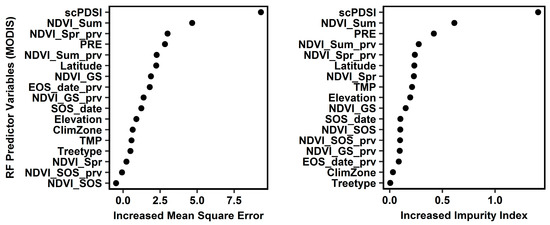 Random-forest variable-importance plot for RF (MODIS) climate-NDVI model. Variables are ranked in terms of importance on the y-axis (with variables of highest importance for explaining RWI at the top). PRE, TMP, scPDSI, Latitude, Elevation, Tree type, and ClimZone represent precipitation, temperature, self-calibrating Palmer Drought Severity Index, latitude of the forest site, elevation of the forest site, tree type (coniferous or broadleaf), and climate zone (B, C or D) as per the Köppen–Geiger climate classification [40], respectively. For definitions of the NDVI phenological metrics: NDVI_GS, NDVI_GS_prv, NDVI_Sum, NDVI_Sum_prv, NDVI_Spr, NDVI_Spr_prv, NDVI_SOS, NDVI_SOS_prv, SOS_date, and EOS_date_prv, see Table 1.