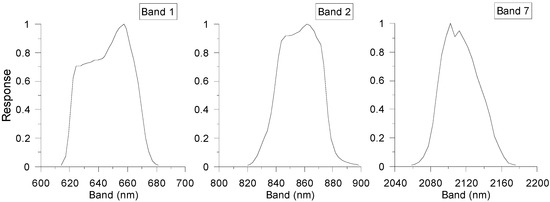 Spectral response functions of MODIS bands 1, 2, and 7.