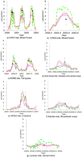 - Garrigues, S.; Lacaze, R.; Baret, F.; Morisette, J.T.; Weiss, M.; Nickeson, J.E.; Fernandes, R.; Plummer, S.; Shabanov, N.V.; Myneni, R.B.; et al. Validation and intercomparison of global Leaf Area Index products derived from remote sensing data. J. Geophys. Res. 2008, 113, G02028. [Google Scholar] [CrossRef]