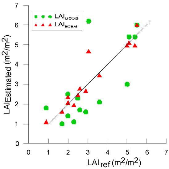 Scatter diagram of the LAI reference and estimated LAIs. The green dots are LAIMODIS, and the red triangles are LAIEDBM.
