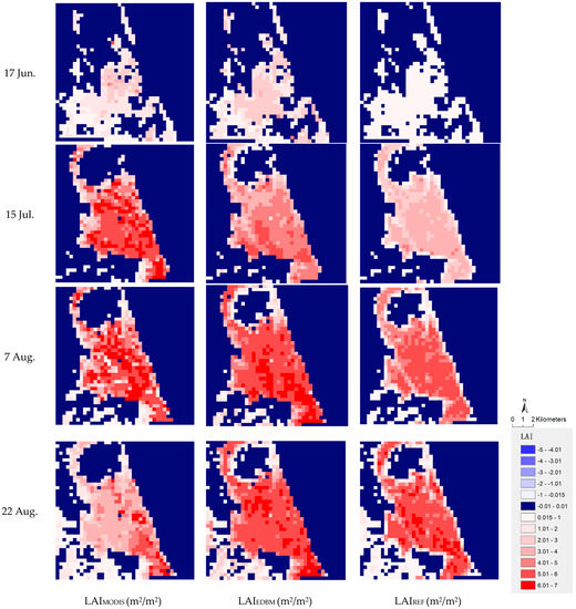 Table 9 shows the mean value of LAIMODIS, LAIEDBM, and the reference LAI map on four dates. The differences between LAIEDBM and the reference LAI maps on 17 June, 15 July, 7 August, and 22 August were 0.35, 0.21, 0.3, and 0.24, respectively, which meets the 0.5 accuracy requirement for LAI use.
