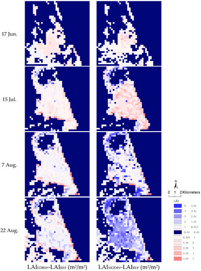 For all four days, the differences between LAIEDBM and the reference LAI maps were spatially stable, with no substantial overestimation or marked underestimation. Difference between LAIMODIS and the reference LAI maps were more acute than difference between LAIEDBM and the reference LAI maps. Especially on 15 July, MODIS has an obvious overestimation of 0.3 and on 22 August, there is an obvious underestimation of 0.64.
