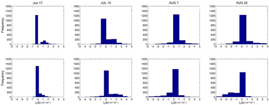 Figure 8 shows a histogram of LAI differences among LAIMODIS, LAIEDBM, and the reference LAI maps. The first row is the differences between LAIEDBM and the reference LAI, and the second row is the differences between LAIMODIS and the reference LAI maps. Each column shows the difference for one day. The histogram illustrates that on 17 June, and 15 July EDBM performed similar with the MODIS algorithm. On 7 and 22 August, the error distribution of EDBM model tends to be normal, while the MODIS has obvious underestimation on these two days.