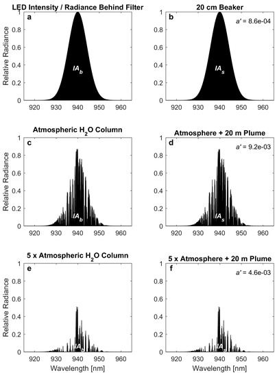 Table 1(C), we expect a detected optical depth of −0.33 at 940 nm. The negative sign means that the plume actually appears 33% brighter than the background. This is a direct effect of the shorter path through the atmospheric water column taken by the plume-scattered radiation. Applying the correction from the off-band channel (Equation (3)) would yield a corrected optical depth of −0.23. Since the off-band channel does not account for atmospheric water vapor absorption, the derived differential optical depth is very far from the true value associated with absorption of light by water vapor in the plume (only 0.0046).