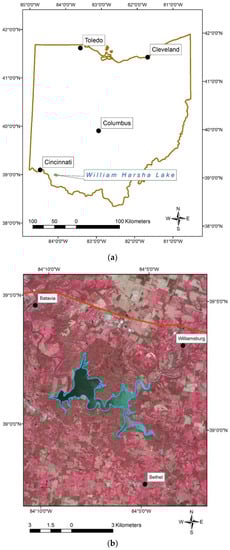 Location maps of Harsha (East Fork) Lake near Cincinnati, Ohio: location in Ohio (a); and in detail (b).