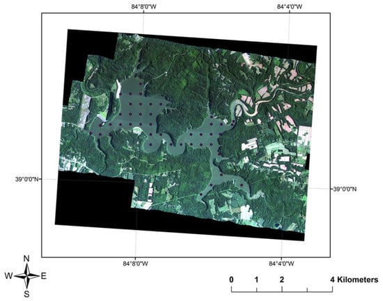 Image of Harsha (East Fork) Lake acquired with a CASI-1500 imager on 27 June 2014 with 44 coincident surface observation locations used in this study.