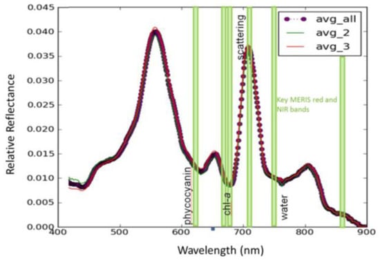 Phycocyanin is a light blue organic compound more specific to cyanobacterial (BGA/PC) values than chlorophyll-a []. The phycocyanin reflectance signature when compared to that of Chl-a is both weaker [] and more difficult to sense directly with most imagers due to the interfering reflectance of chlorophyll-a and other spectrally active substances in water with abundant phytoplankton and/or sediment [,] (Figure 3). This interference makes the width and spacing of spectral bands for each imager important with regard to avoiding other spectral components [,,,,,,,,,].