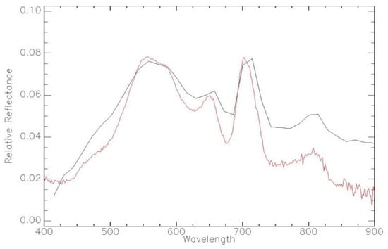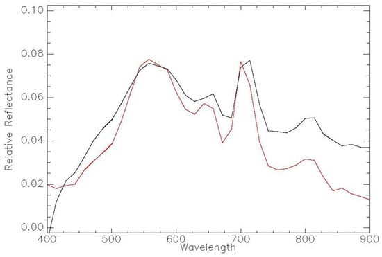 Averaged ASD surface relative reflectance spectra (red) resampled to the same wavelengths as our CASI data vs. Averaged CASI reflectance spectra (n = 16) (black) for Harsha Lake with CASI data normalized to ASD at 550 nm. Wavelength in nm.