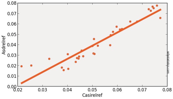 Pearson’s test of linear correlation for ASD vs. CASI relative reflectance values at 32 wavelengths (n = 32). r2 = 0.89, p < 0.001, degrees of freedom = 30, slope = 1.265, intercept = −0.024.