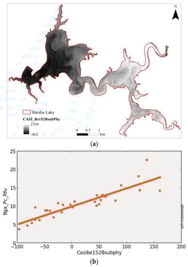 Results of CASIBe152BsubPhy (715sub615) algorithm (this paper) as raw index values as applied to original CASI imagery with brighter pixels in the reservoir indicating higher BGA/PC values (a). Evaluation via observed (Y axis = BGA_PC_RFU) vs. predicted (calculated) raw CASIBe152BsubPhy (715sub615) index value with Pearson’s r2 (r2 = 0.776 p < 0.001, n = 29 to avoid shorelines) (b). Evaluation via observed (Y axis = BGA_PC_RFU) vs. normalized predicted (calculated) BGA values (CASIBe152BsubPhyPHY) with Pearson’s r2 (r2 = 0.776, p < 0.001, n = 29 to avoid shorelines) (c). Details of the synthetic bands and band math are available in Table 1 and Table 2, respectively.
