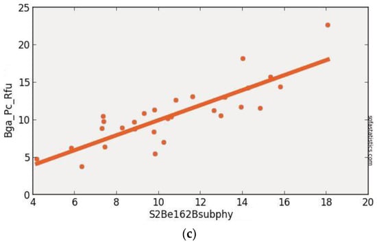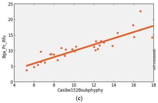 Results of S2Be162Bsub algorithm (this paper) converted to BGA values as applied to synthetic Sentinel-2 imagery with brighter pixels in the reservoir indicating higher BGA values (a). Evaluation via observed (Y axis = BGA_PC_RFU) vs. predicted (calculated) raw index value (S2Be162Bsub) with Pearson’s r2 (r2 = 0.704, p < 0.001, n = 29 to avoid shorelines) (b). Evaluation via observed (Y axis = BGA_PC_RFU) vs. normalized predicted (calculated) BGA values (S2Be162BsubPHY) with Pearson’s r2 (r2 = 0.704, p value < 0.001, n = 29 to avoid shorelines) (c). The CASI data allowed the synthesis of Sentinel-2 bands 2 through 9 only. Details of the synthetic bands and band math are available in Table 1 and Table 2, respectively.
