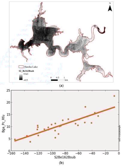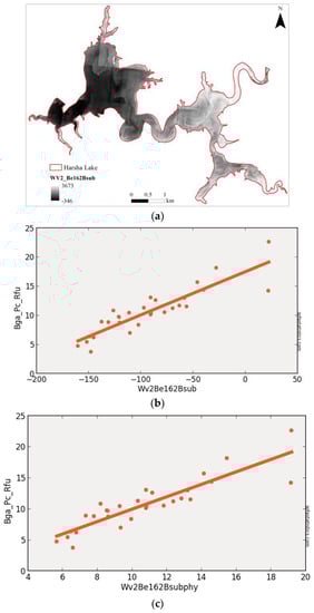 Results of WV2Be162Bsub algorithm (this paper) as raw index values as applied to synthetic WorldView imagery with brighter pixels in the reservoir indicating higher BGA values (a). Evaluation via observed (Y axis = BGA_PC_RFU) vs. predicted (calculated) raw index value (WV2Be162Bsub) with Pearson’s r2 (r2 = 0.790, p < 0.001, n = 29 to avoid shorelines) (b). Evaluation via observed (Y axis = BGA_PC_RFU) vs. normalized predicted (calculated) BGA values (WV2Be162BsubPHY) with Pearson’s r2 (r2 = 0.790, p < 0.001, n = 29 to avoid shorelines) (c). Details of the synthetic bands and band math are available in Table 1 and Table 2, respectively.