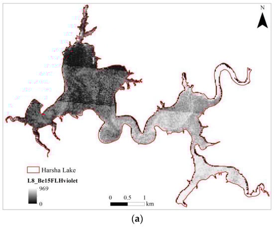 None of the simple spectrally-oriented semi-analytical algorithms (based at least in part on known spectral features associated with known water quality parameters) considered here had acceptable performance (Pearson’s r2 > 0.6; p < 0.001) with regard to BGA estimation with Landsat-8 in this exercise due to its design for land vegetation (Chl-a) rather than BGA/PC in water. Index imagery with raw and normalized index Type 1 (Pearson’s r) linear regressions are shown for the best performing algorithm (L8Be15Flhviolet) in Figure 10. Local empirical algorithms based on other water quality parameters such as Chl-a and turbidity with local calibration and validation are required for use with Landsat-8 for reliable BGA estimation because Landsat-8 cannot sense the 620 nm phycocyanin absorption feature [].