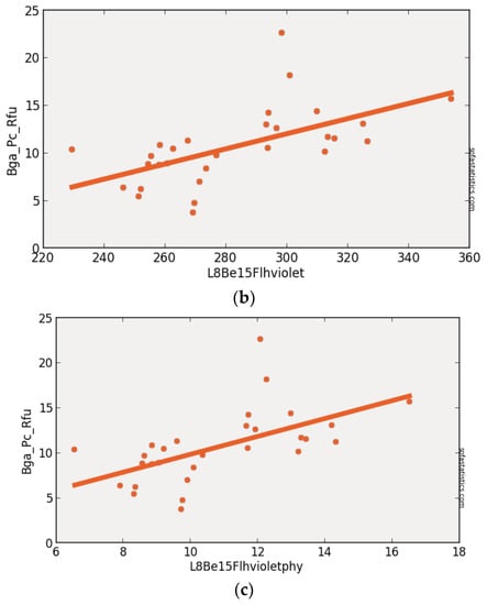 We also conducted an extensive survey of other water quality parameters in the lake at the time of acquisition in order to determine why some proxy indices such as Chl-a may also work with regard to BGA estimation. Details of our statistical treatment of the data are available in Beck et al. []. Type 1 (Pearson’s) r2 values were used to evaluate algorithm performance with raw index values vs. BGA/PC relative fluorescence units (BGA_PC_RFU) values measured with YSI BGA optical sondes in the water (Table S2) and as index values normalized to BGA values vs. BGA_PC_RFU values (Table S3) to facilitate comparison.
