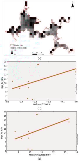 Results of MODISMM12NDCI4 algorithm [] converted to BGA values as applied to synthetic MODIS imagery with brighter pixels in the reservoir indicating higher BGA values (a). Evaluation as raw index values as applied to synthetic MODIS imagery and its evaluation via observed (Y axis = BGA_PC_RFU) vs. predicted (calculated) raw index value (MODISMM12NDCI4) with Pearson’s r2 (r2 = 0.183, p = 0.126, n = 9 due to large pixels) (b). Evaluation via observed (Y axis = BGA_PC_RFU) vs. normalized predicted (calculated) BGA values (MODISMM12NDCI4PHY) with Pearson’s r2 (r2 = 0.183, p = 0.126, n = 9 due to large pixels) (c). Details of the synthetic bands and band math are available in Table 1 and Table 2, respectively.