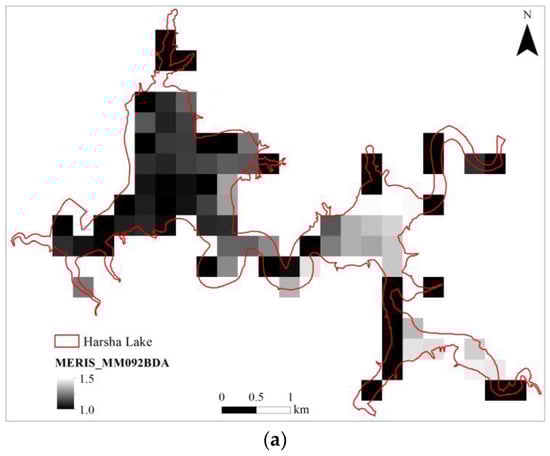 We applied the 13 existing and four new algorithms in the form of 35 variants for BGA estimation to synthetic Sentinel-3/MERIS/OLCI data for Harsha Lake with limited success (Tables S1, S2 and S4, Figure 12) before severe masking (Figure 12a). MERIS has a narrow band capable of measuring the 620 nm phycocyanin absorption feature. Ten of the BGA (direct) and Chl-a (indirect or proxy) spectrally-oriented semi-analytical algorithms considered here had acceptable performance (Pearson’s r2 > 0.6; p < 0.001) when tested against in situ YSI BGA probe data (BGA_PC_RFU) with this sensor in this experiment after severe masking. In order of decreasing performance, the MERISMM092BDA, MERISBe16NDPhyI, MERISMM12NDCI, MERISGo04MCI, MERISWy08CI and MERISKu15PhyCI, MERISSi052BDA, MERISBe162Bsub, MERISHu103BDA, and MERISMM143BDAopt algorithms all estimated BGA well in this exercise. We agree that MERIS/OLCI can be a part of operational water quality monitoring systems []. However, high-spatial resolution CASI data show that there was significant spatial heterogeneity in the values of BGA on a scale much finer than either Sentinel-3/MERIS/OLCI (300 m) or MODIS (250 m) pixels. Index imagery with raw and normalized index Type 1 (Pearson’s r) linear regressions are shown for the best performing algorithm (MERISMMO92BDA) in Figure 12.